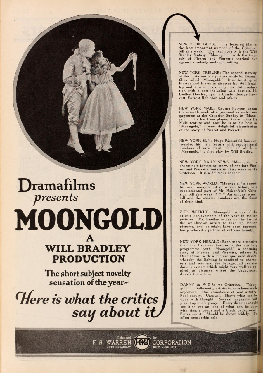 - Moongold: a pierrot pantomime, three-reel short (a.k.a. Lune d’amour, fantasy, Dramafilm Productions, May 1921). Written and directed by Will H. Bradley. Cinematography by Harry W. Smith. Produced by Dramafilm Productions. Released by F.B. Warren Corporation (copyrighted 25 Aug 1921 F.B. Warren Company). Distributed by the American Releasing Corporation (1923).